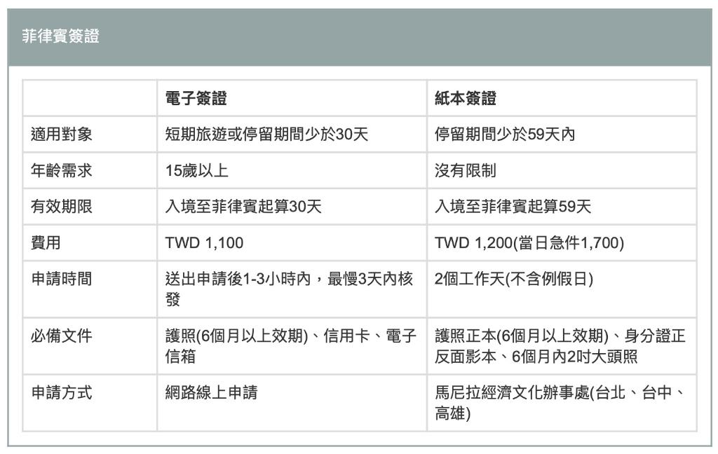 台灣人入境菲律賓簽證主要分為電子簽證及紙本簽證兩種,國人可依據在菲律賓的停留天數選擇適用的簽證版本,兩者主要差異如下: