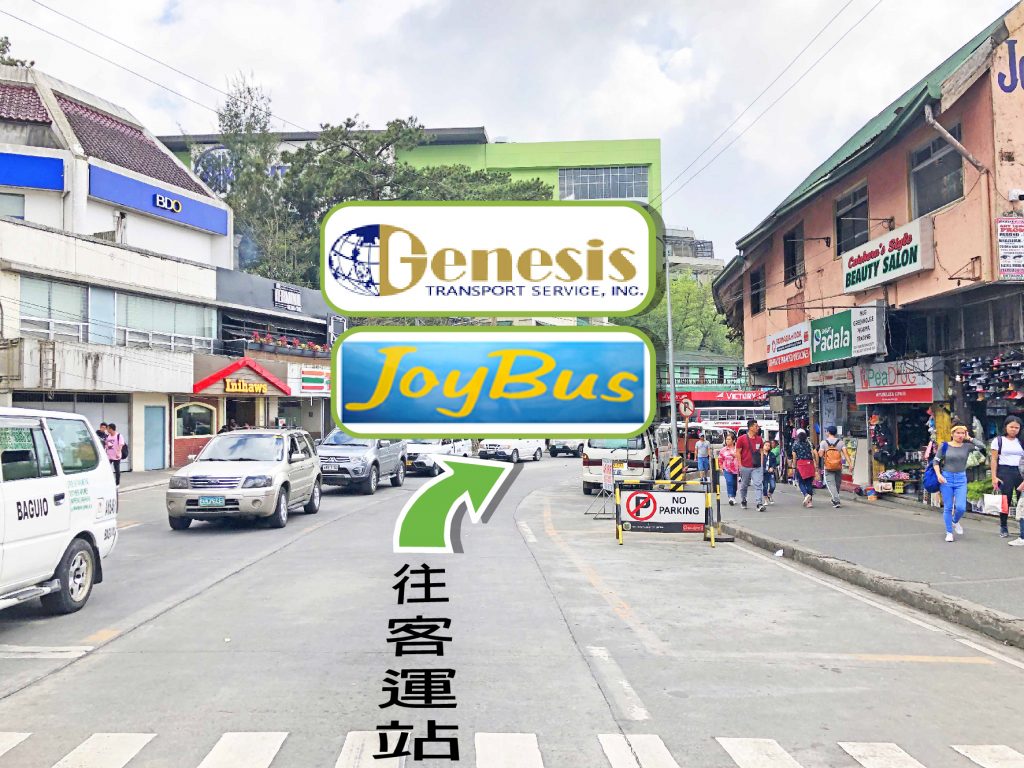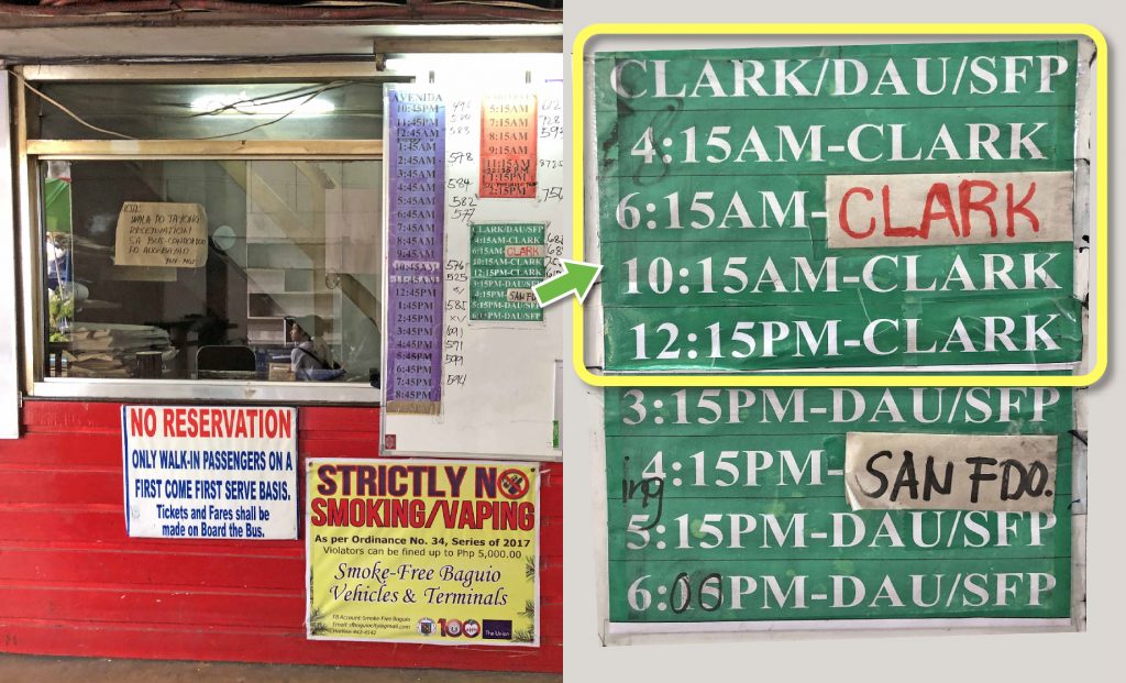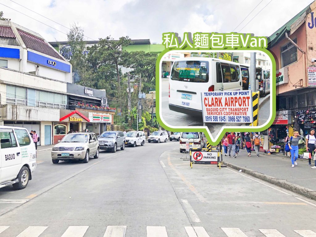 碧瑤的客運站其實都集中在SM City周圍,SM City下斜坡後,經過樓梯往左轉,便會看到許多客運車輛及人潮,首先第一站會先到私人麵包車Van的乘車處,位於7-11斜對面,大大的招牌寫著Clark Airport。