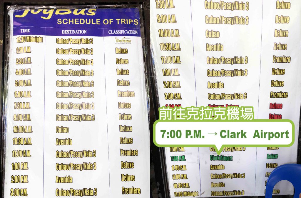 由時刻表可以看的出來,Joy Bus 大部分車輛前往馬尼拉機場三航廈 ,直達克拉克機場班次每日僅提供晚上7點一班車次,採現場劃位購票,車資₱500 。